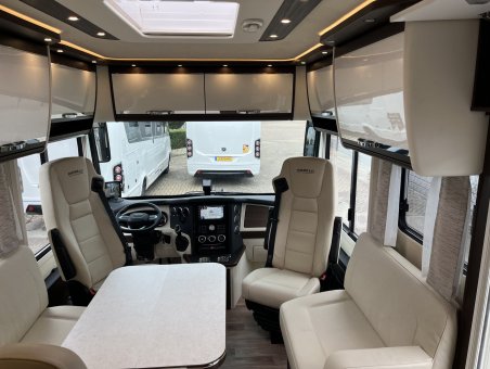 Satelliet TV systeem Oyster V met 32 "LED flatscreen in de bovenste dinette kast (bestuurderszijde naast de bar zithoek) met glazen, elektrisch neerlaatbaar, 85 cm schotel, volautomatische ontvangst, multi-user apparatuur middels TWIN-LNB en 24" LED flatscreen in de slaapkamer (Totale voertuighoogte verhoging met ca. 80 mm)